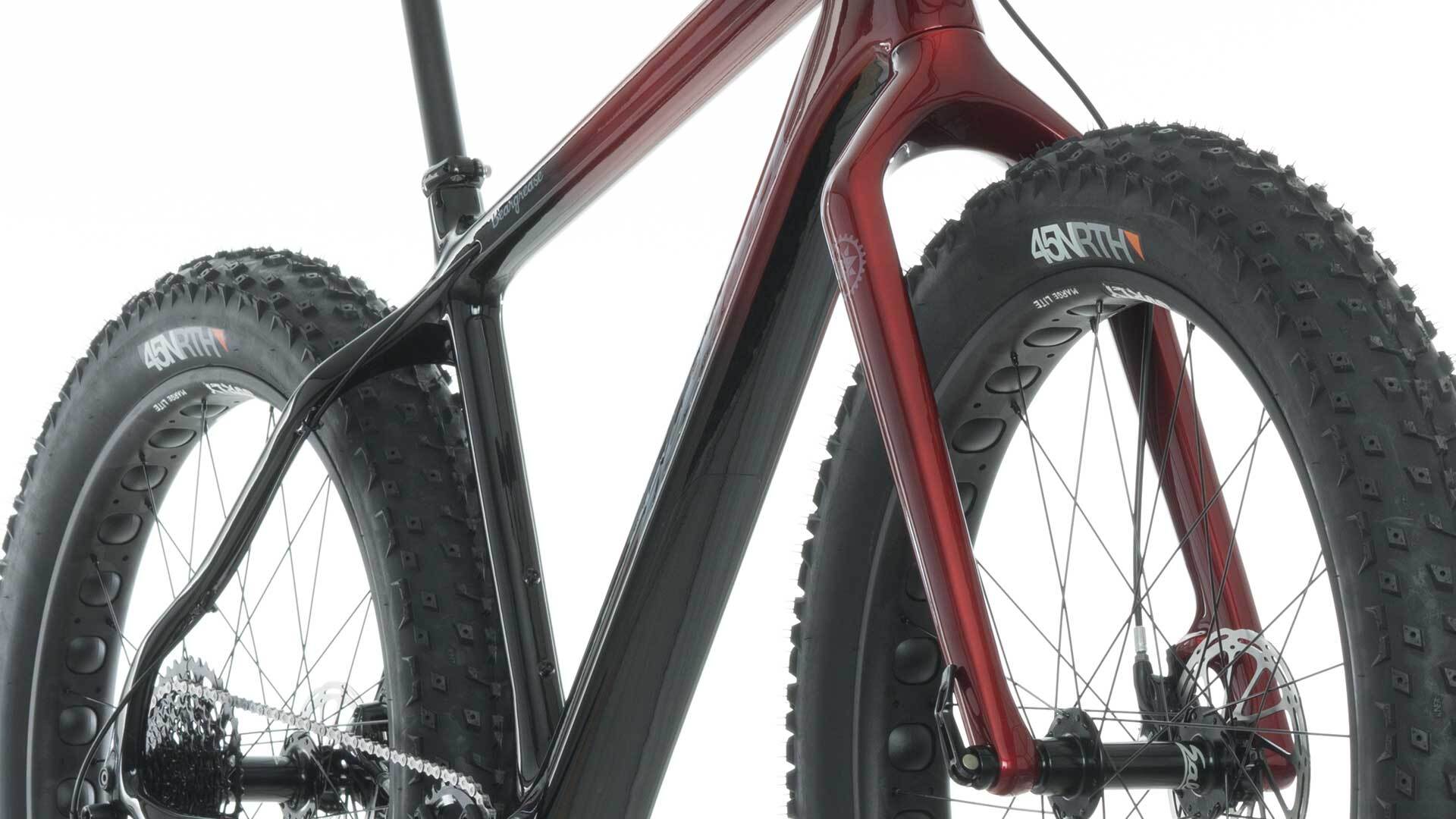 Beargrease Carbon is designed for use with 26 x 4" fat bike wheels on rims up to 100mm wide. The frame is also compatible with the following wheel and tire combinations: 26 x 4.33" on up to a 100mm rim (1x drivetrain only), 26 x 4.34–4.7" on up to 82mm rim (1x drivetrain only), 29 x 2.25–3" (including 29+), 27.5 x 3.0–3.25" (aka 27.5+)
