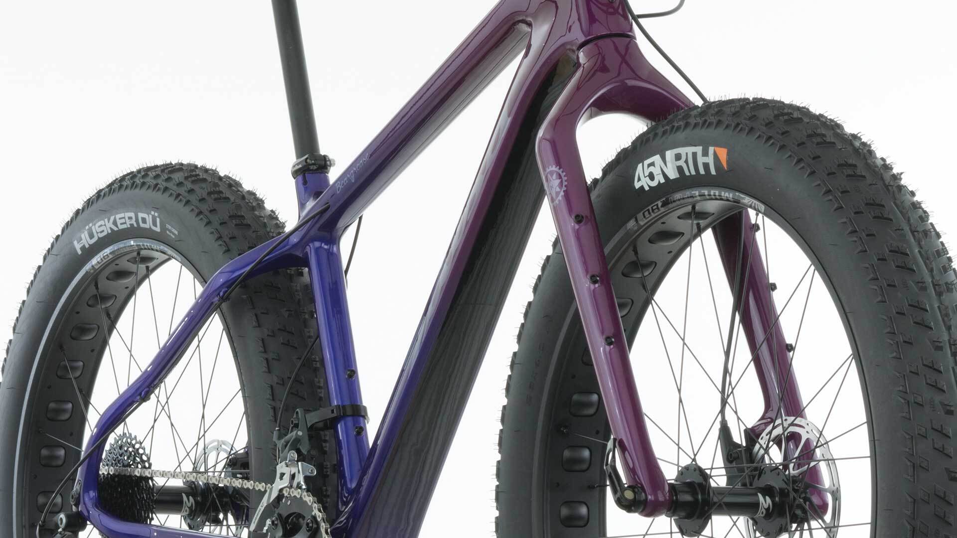 Beargrease Carbon is designed for use with 26 x 4" fat bike wheels on rims up to 100mm wide. The frame is also compatible with the following wheel and tire combinations: 26 x 4.33" on up to a 100mm rim (1x drivetrain only), 26 x 4.34–4.7" on up to 82mm rim (1x drivetrain only), 29 x 2.25–3" (including 29+), 27.5 x 3.0–3.25" (aka 27.5+)