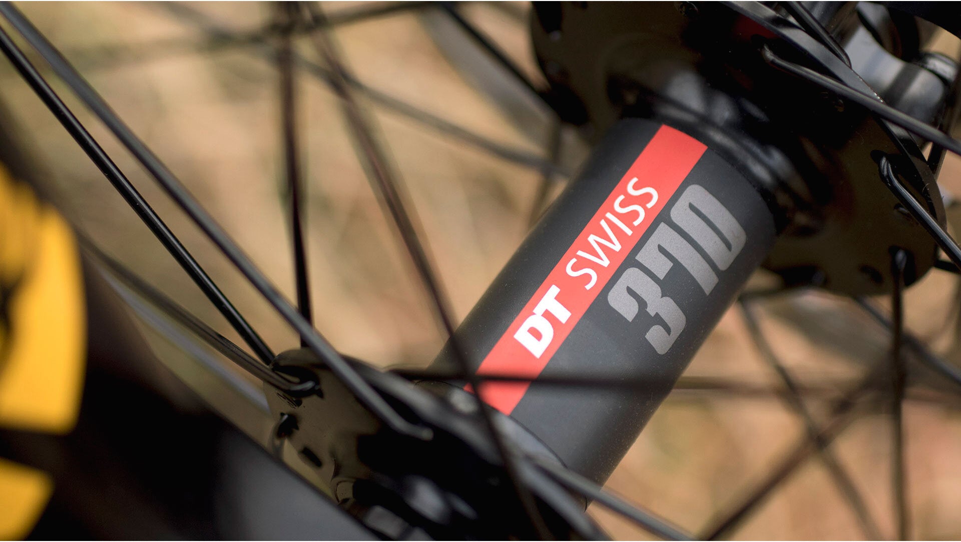 - Rear Wheel: DT Swiss 370 148 Boost 32h, WTB Asym i35 tubeless-ready, 2.0/1.8mm butted spokes, brass nipples