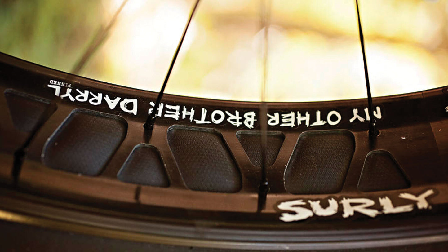 - Front Wheel: Salsa 32h, 150mm, 15mm Thru-Axle, Surly MOBD, 2.0 spokes, brass nipples