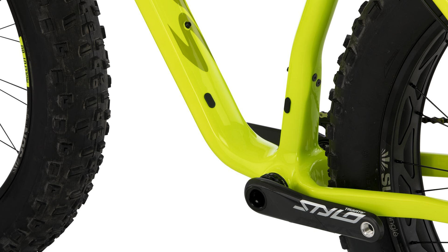 The Mukluk frame is 1x and 2x compatible and designed for premium drivetrain performance while maintaining narrow fat bike crank arms for less knee stress: 197mm symmetrical rear end for modern rim/tire fit / 100mm threaded bottom bracket / Rider-friendly narrow Q-Factor cranks / 1x or 2x frame design / Up to a 32t max chainring for 1x setups; 36/24t max for 2x setups