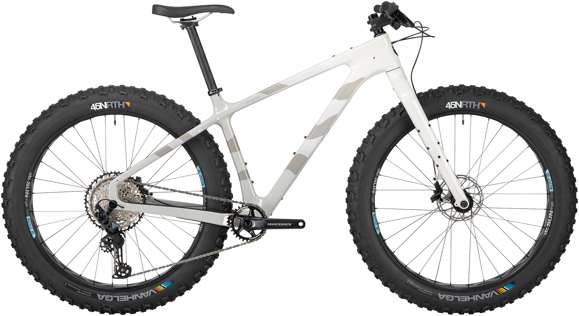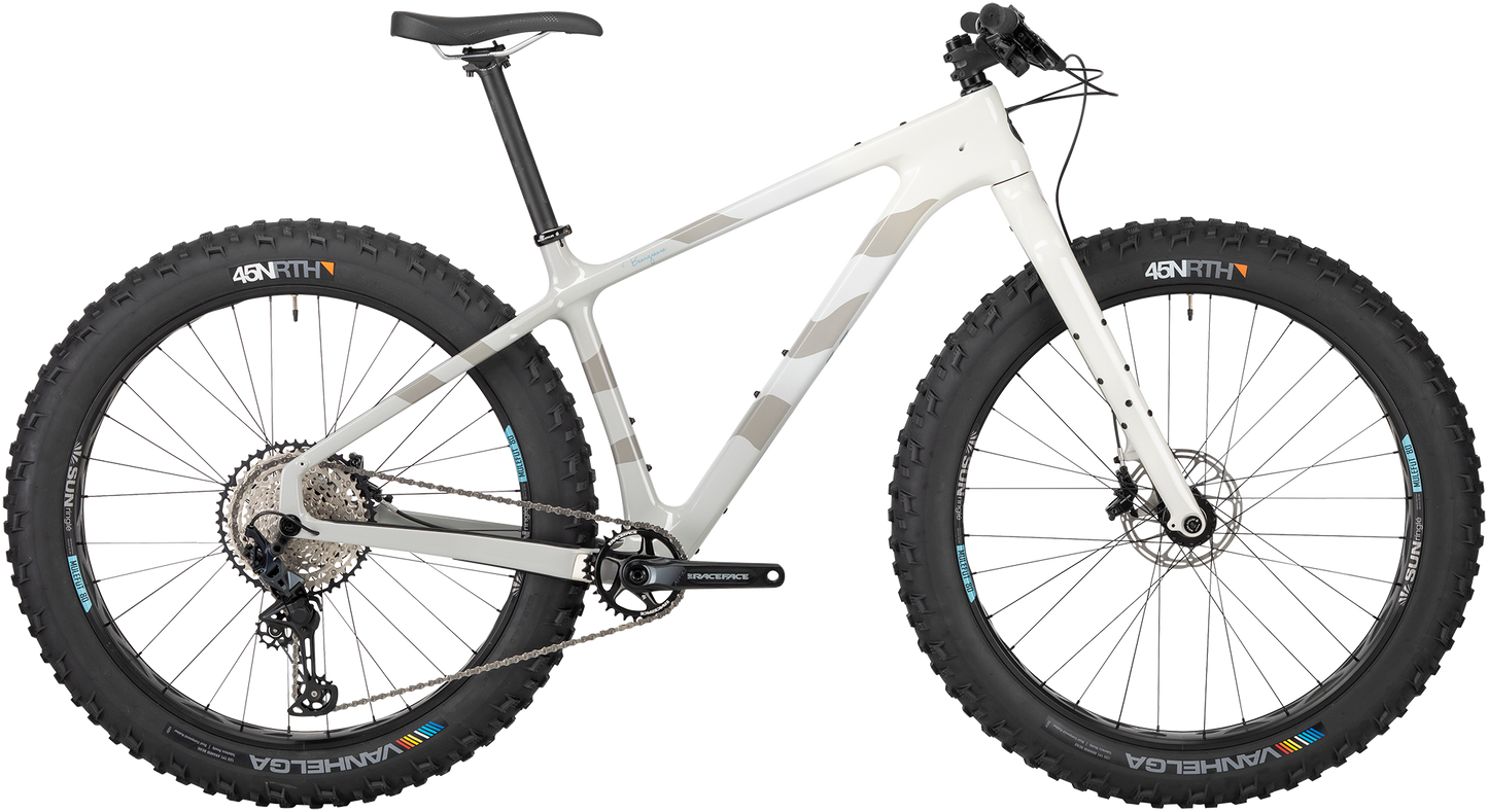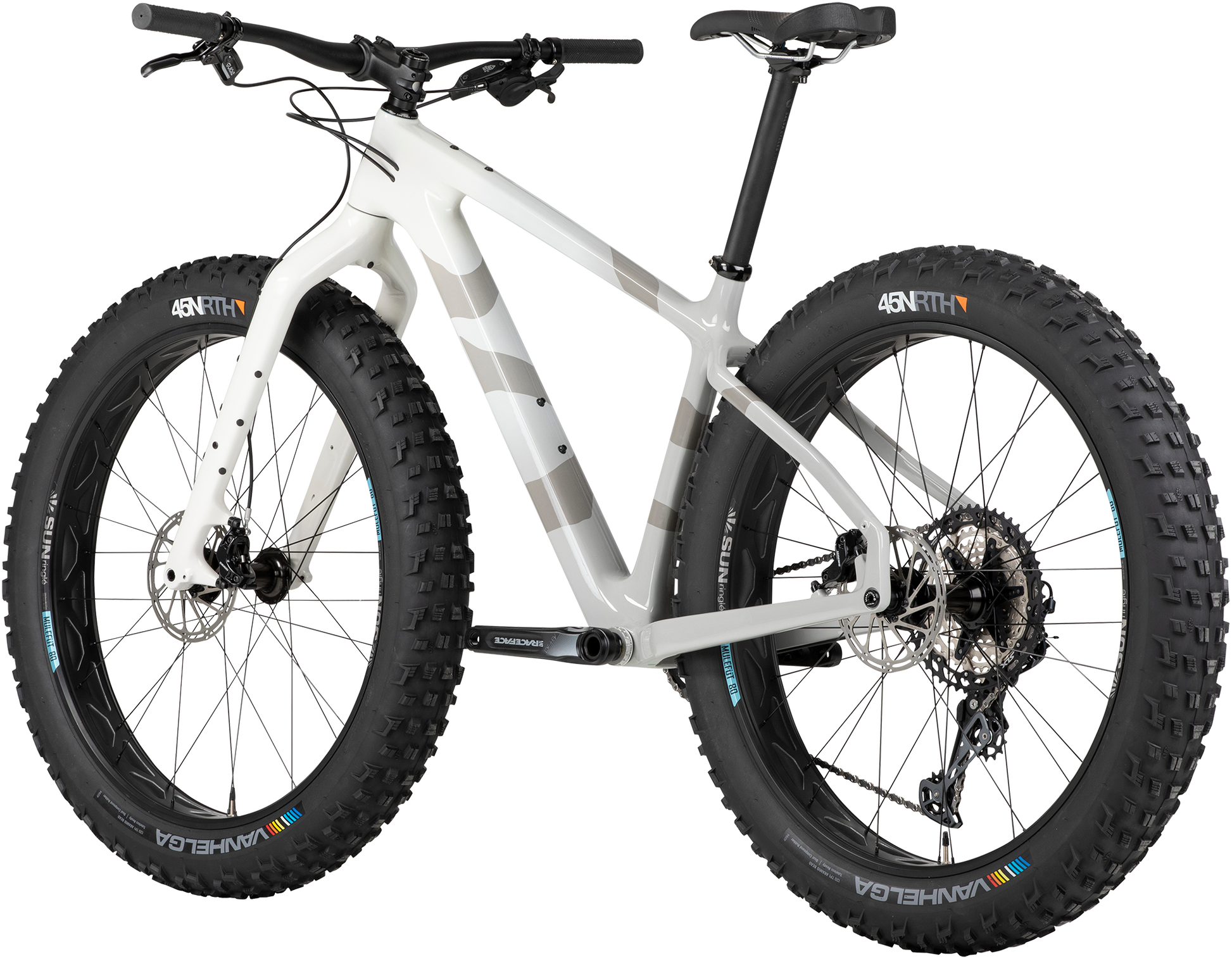 The Beargrease Carbon frame is designed for the best of all drivetrain performance while maintaining narrow fat bike crank arms for less knee stress: 197 mm symmetrical rear end for modern rim and tire fit; 100 mm threaded bottom bracket; Rider-friendly narrow Q-factor cranks; 1x optimized frame design; Up to a 32t max chainring