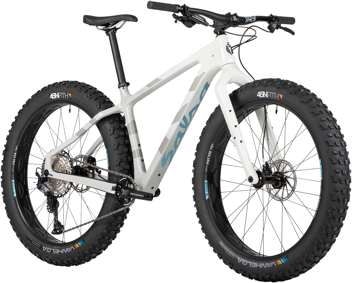 A long front/center, short stem, and wide bars, and 440 mm chainstays create room to move and add confidence while maneuvering on tight trails. This geometry results in a fat bike that rides like a trail bike. It is stable, steers well in loose conditions, and remains nimble and agile despite the massive wheels and tires. The low bottom bracket height is also key to keeping the rider’s center of gravity low, which makes dabbing, dismounting, and remounting easier