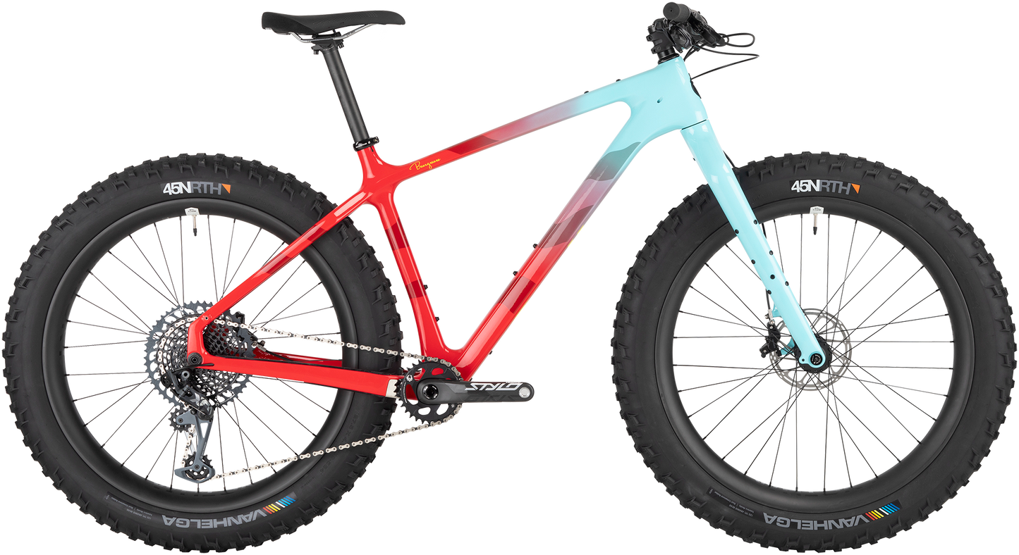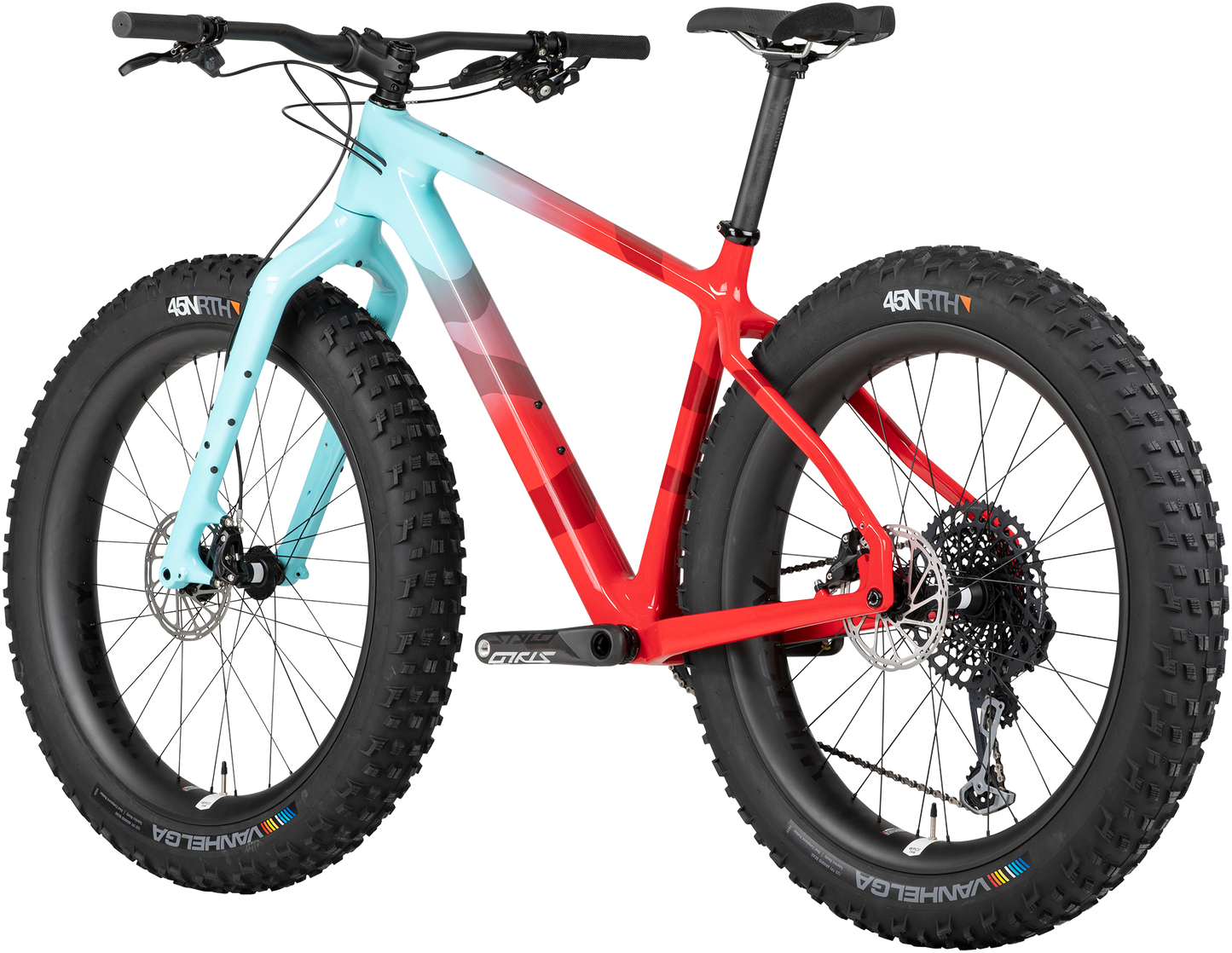 The Beargrease Carbon frame is designed for the best of all drivetrain performance while maintaining narrow fat bike crank arms for less knee stress: 197 mm symmetrical rear end for modern rim and tire fit / 100 mm threaded bottom bracket / Rider-friendly narrow Q-factor cranks / 1x optimized frame design / Up to a 32t max chainring