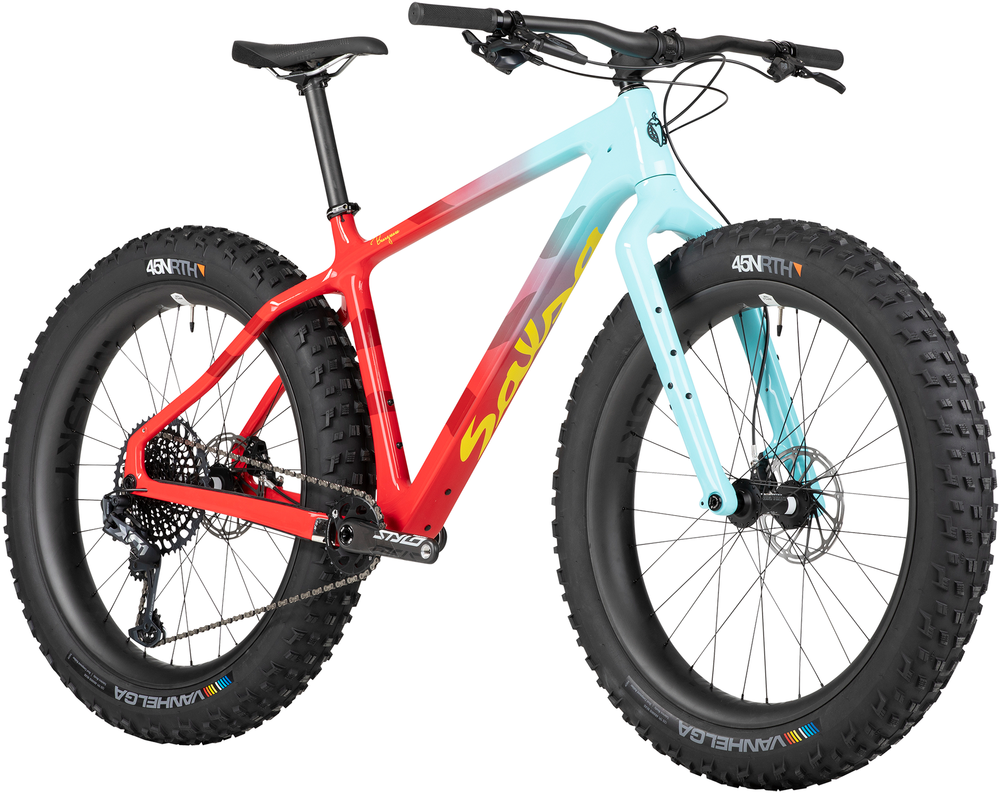 A long front/center, short stem, and wide bars, and 440 mm chainstays create room to move and add confidence while maneuvering on tight trails. This geometry results in a fat bike that rides like a trail bike. It is stable, steers well in loose conditions, and remains nimble and agile despite the massive wheels and tires. The low bottom bracket height is also key to keeping the rider’s center of gravity low, which makes dabbing, dismounting, and remounting easier