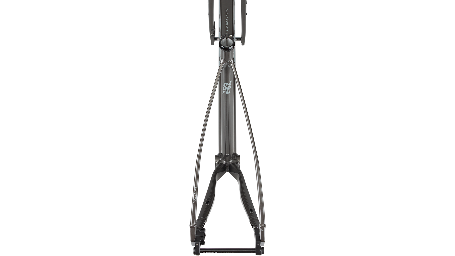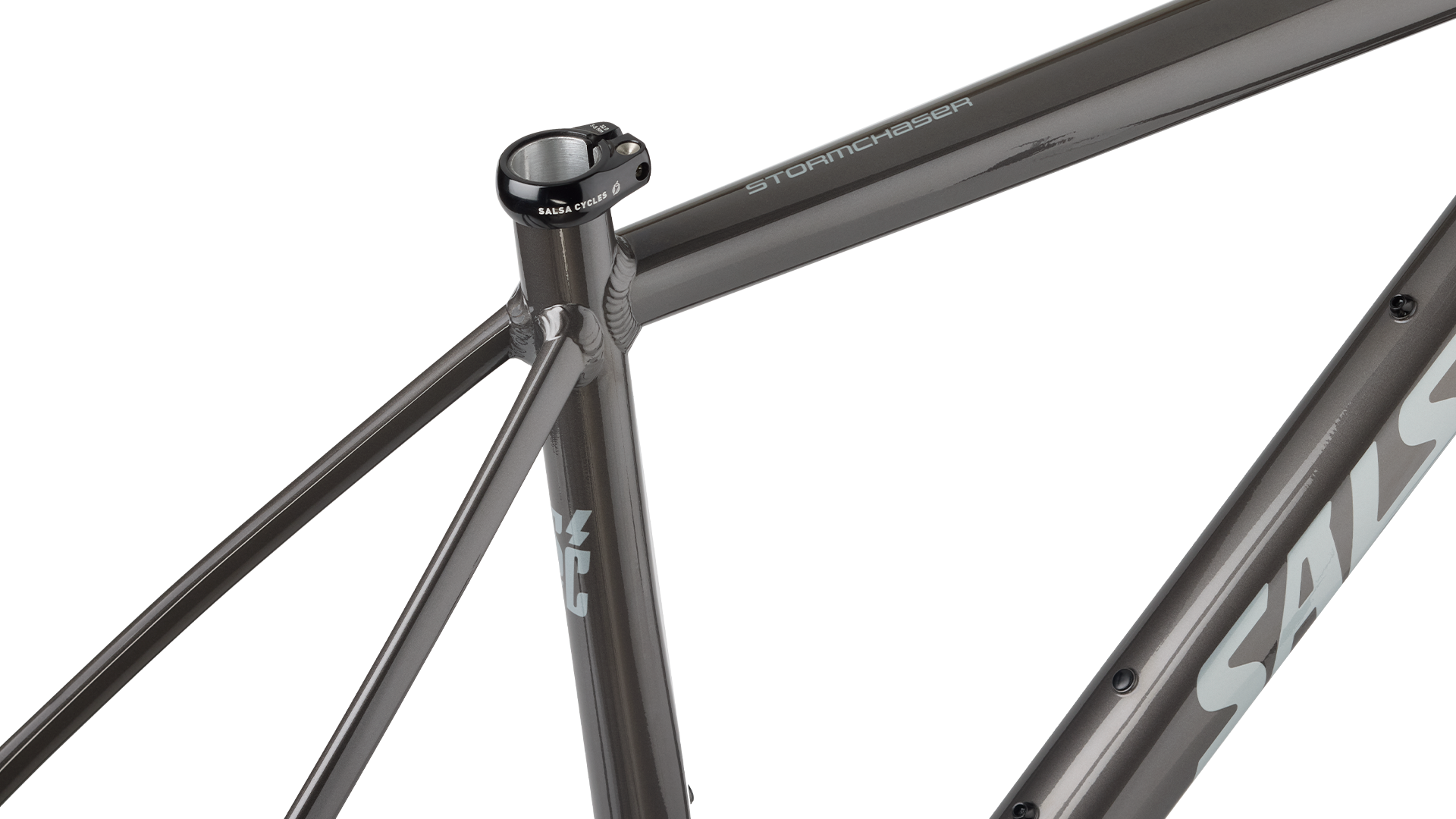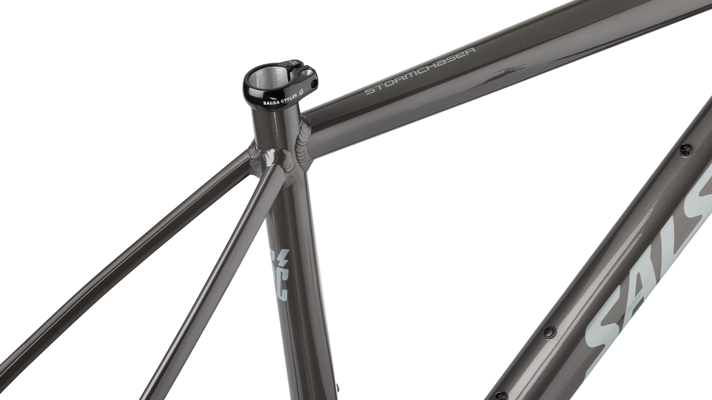Stormchaser features geometry similar to our Warbird gravel race bike. Stormchaser places the rider in a position that can be maintained for hours on end over bumpy B-roads and loose surfaces, drastically reducing fatigue. A low bottom bracket and stable wheelbase help keep the tires planted and boost confidence. A long top tube paired with a short stem provides increased stability at high speed and on rough descents