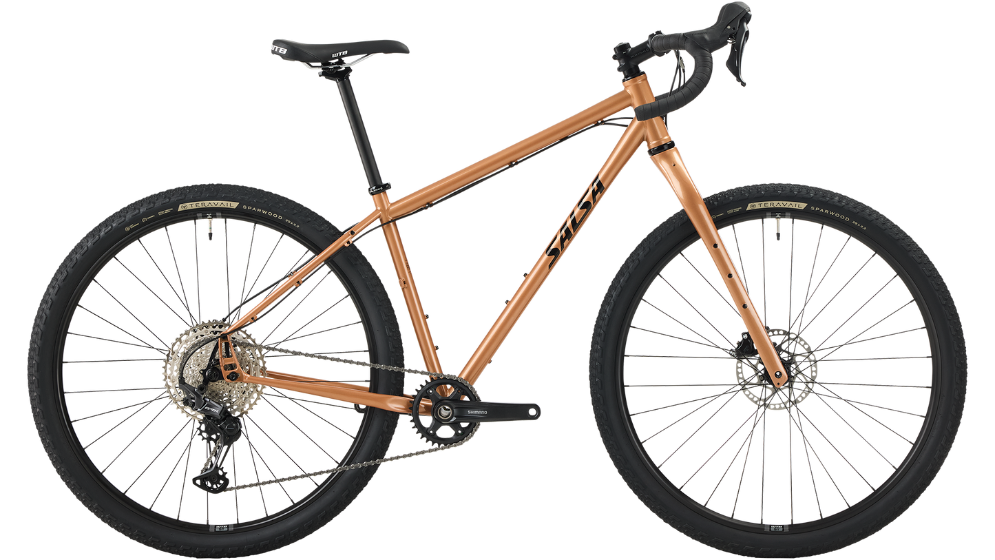 Whether you dream of local overnighters or round-the-world epics, Fargo GRX 610 can help bring it to life. Its triple-butted steel frame and Cutthroat Carbon Deluxe fork create a comfortable-yet-durable ride that’s engineered for loaded touring on mixed terrain. Adjustable Alternator 1.0 Flat Mount dropouts let you tinker with wheelbase and ride feel, and cargo mounts galore give you the freedom to roam farther between resupplies. Shimano’s GRX 610 1 x 12 drivetrain is a smooth-shifting system with more enough gear range for climbing the Cordillera Blanca or capitalizing on tailwinds in Croatia. Fargo’s ride quality and adaptability make it a smart choice for a steel bikepacking bike — we know you’ll go far together.
