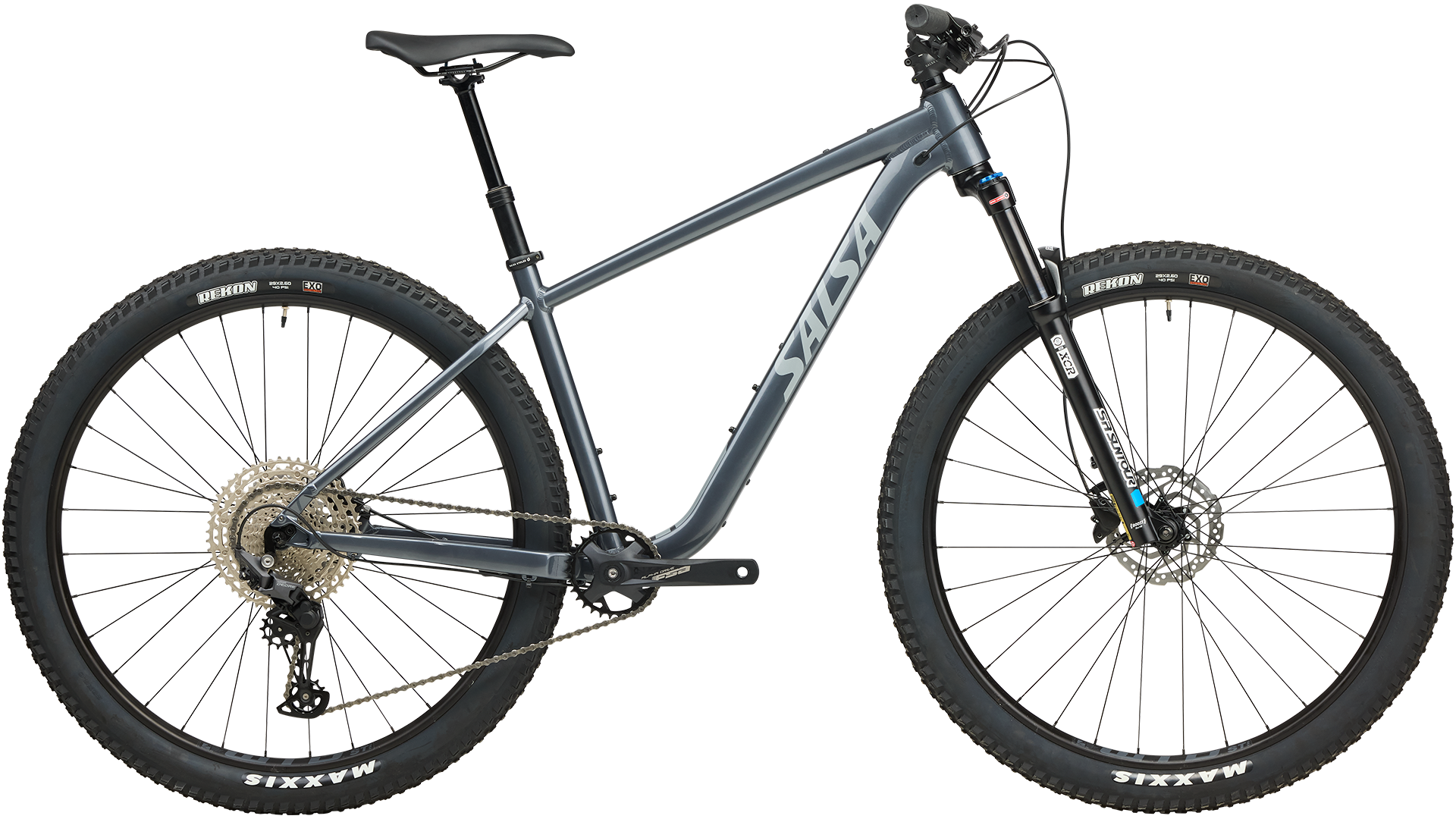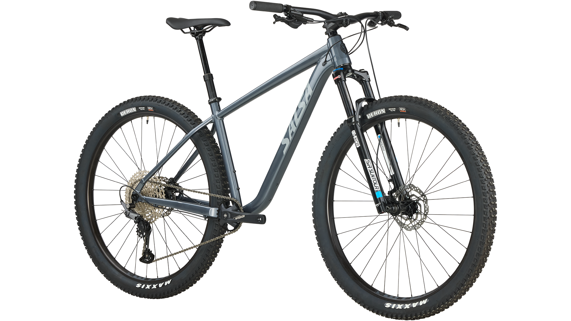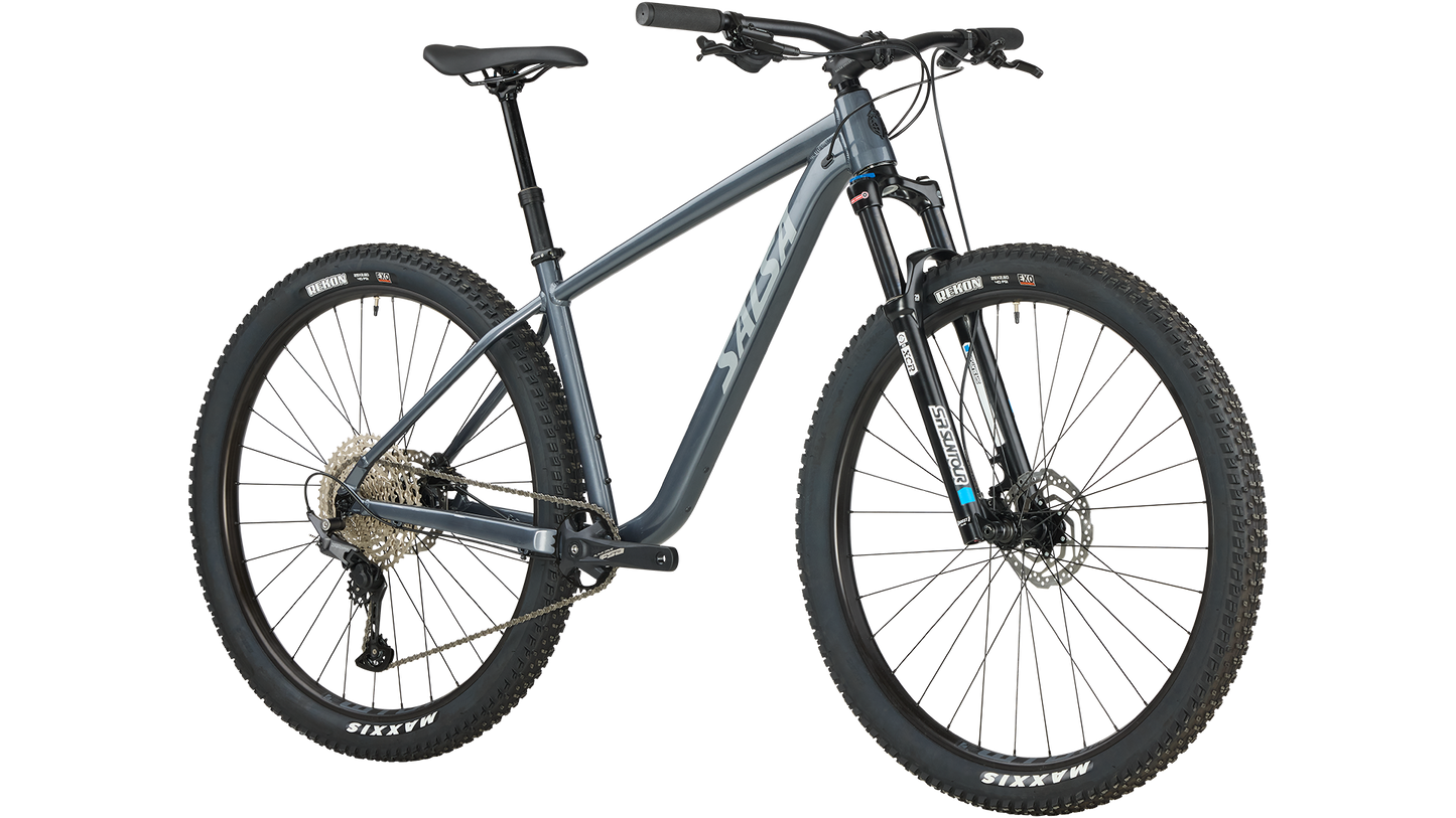 A 120 mm fork soaks up the trail and a thru-axle keeps the front end stiff for precise handling