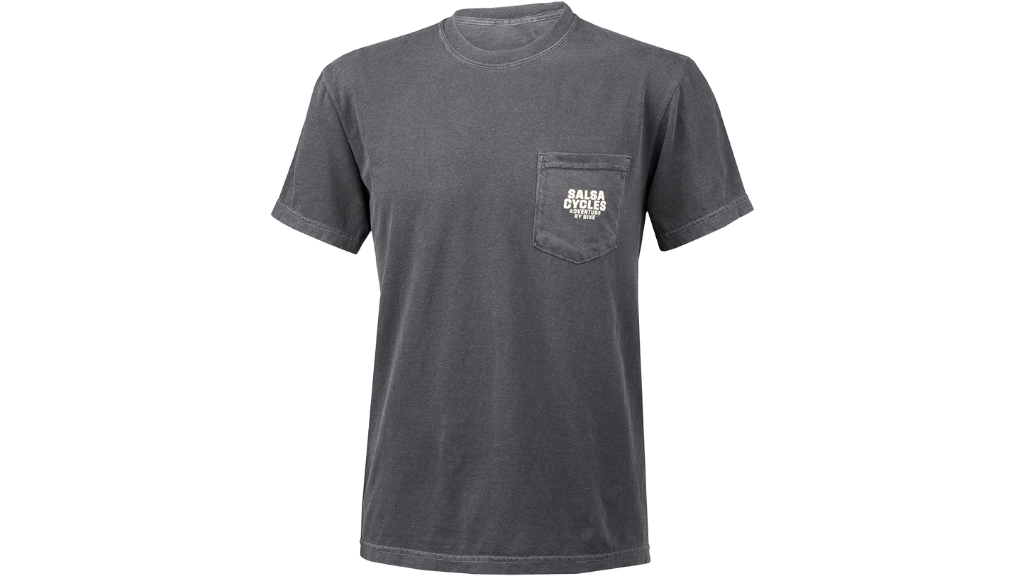 This Salsa logo pocket tee is our new favorite bike t-shirt and our go-to for trailhead hangouts or tinkering on bikes. Our Adventure by Bike motto on the pocket is a reminder that you can find adventure on any ride.